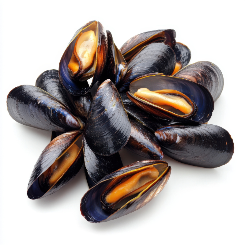 Mejillones enteros con carne jugosa y sabor del mar.